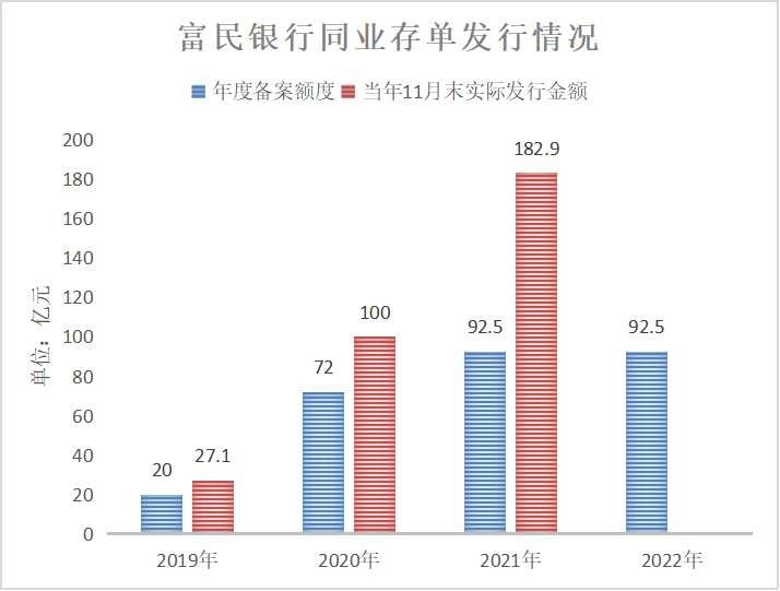 同业存单发行方面,富民银行计划2022年发行同业存单92.5亿元,与2021年持平。不过,记者梳理发现,富民银行2019年至2021年备案的同业存单发行计划额度一直呈现逐年增长趋势,且年年超额发行。截止2021年11月末,富民银行同业存单实际发行量达到了182.9亿元,与备案金额92.5亿元相比近乎翻倍。