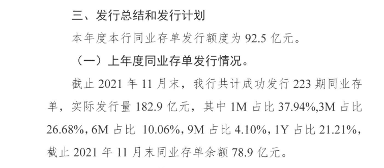 该行申请的2021年度备案同业存单发行额度因此增加至92.5亿元。不过,截至2021年11月末,该行共发行233期同业存单,实际发行量达到了182.9亿元,几乎是备案额度的2倍,截至2021年11月末同业存单余额78.9亿元。