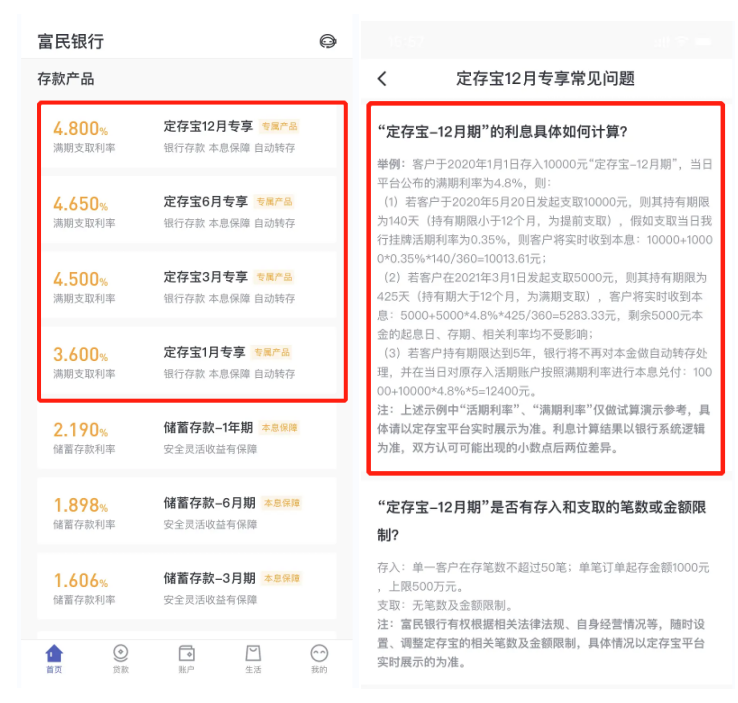 富民银行也上线了类似产品。例如,该行曾推出“富多利”产品,存期满30天后利率可达到4.2%,满1年后利率可达到4.75%。这一利率水平在众多民营银行智能存款产品中也颇具优势。在2020年年底,富民银行的“定存宝”产品1月期年化收益仍达到了3.6%,3月期“定存宝”年化收益为4.5%。