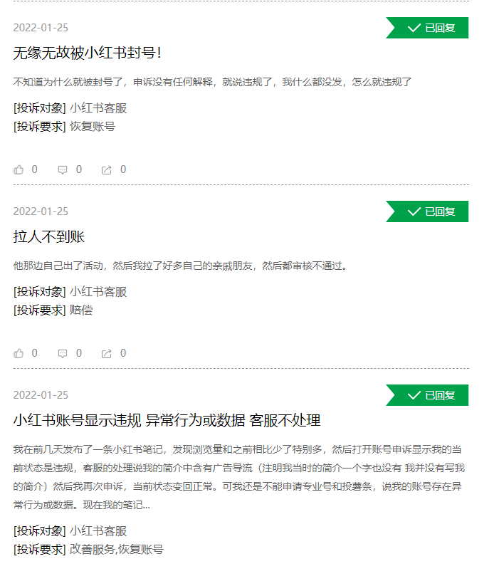 而在黑猫投诉平台上,也有部分用户对小红书的违规判定机制提出质疑。截至1月25日,黑猫投诉平台上共有7565条投诉。其中,记者以“小红书限流”为关键词可获得63条结果;以“小红书封号”为关键词,可以搜到174条结果。