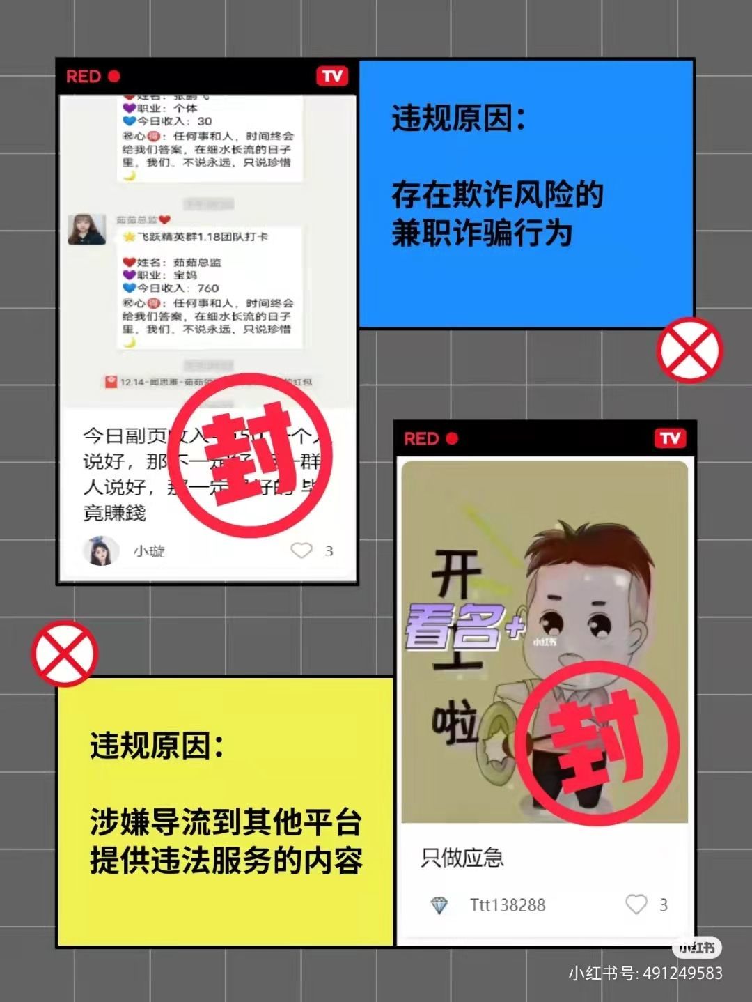 “晒200多万元高额工资”、“逃避防疫政策攻略”、“诱导性营销”等违规内容在小红书上此起彼伏。而近日,小红书又封禁了358个违规账号,涉及色情低俗、未成年不良、违法违规、不良导向等违规内容;公布了最新的13家违规营销主体,主要涉及代写代发、虚构真实消费体验等违规行为。