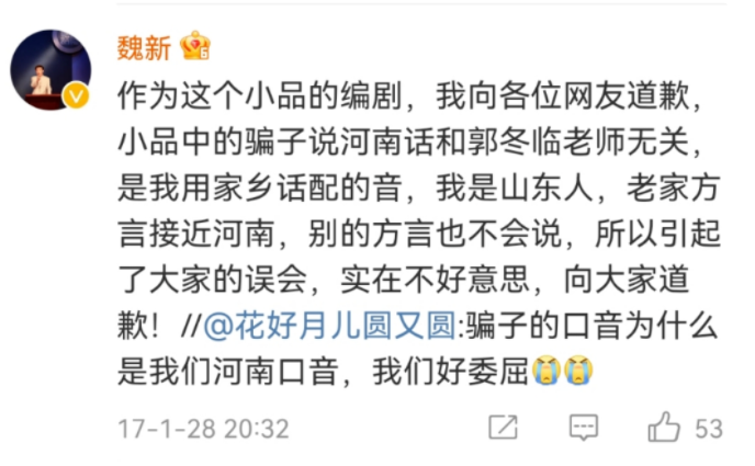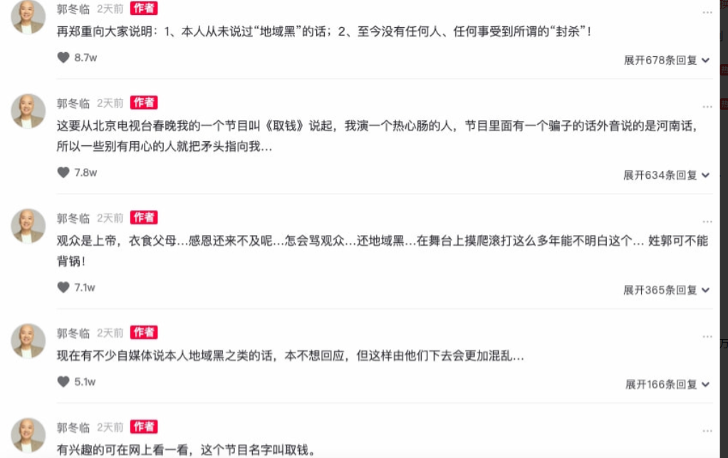 却因为一个小品《取钱》而翻车,被大家质疑“地域黑”,更是时不时拿出来“溜”,后来郭冬临忍无可忍了,在社交平台上解释,自己并没有歧视,这件事的影响才算慢慢平复下来。