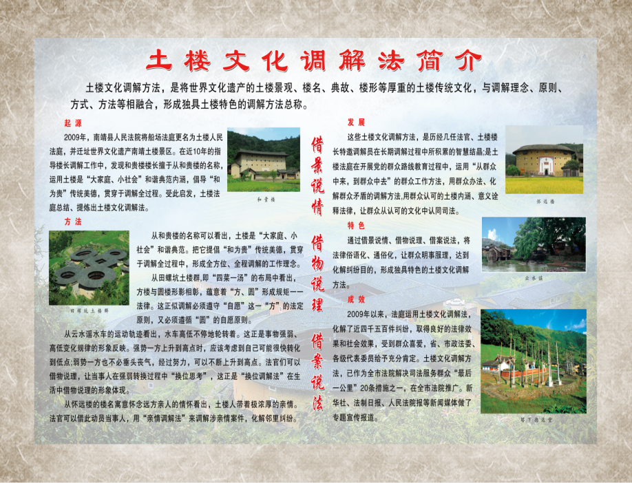 为弘扬新时代“枫桥经验”,土楼法庭深入挖掘,将著名的土楼景观、楼名、内涵与典故等厚重的土楼传统文化,与办案理念、法律适用、调解原则、工作方式方法等司法元素相融合,创立了独特的借景说情、借物说理、借案说法的“土楼文化调解法”,形成了独具特色的土楼法庭文化。