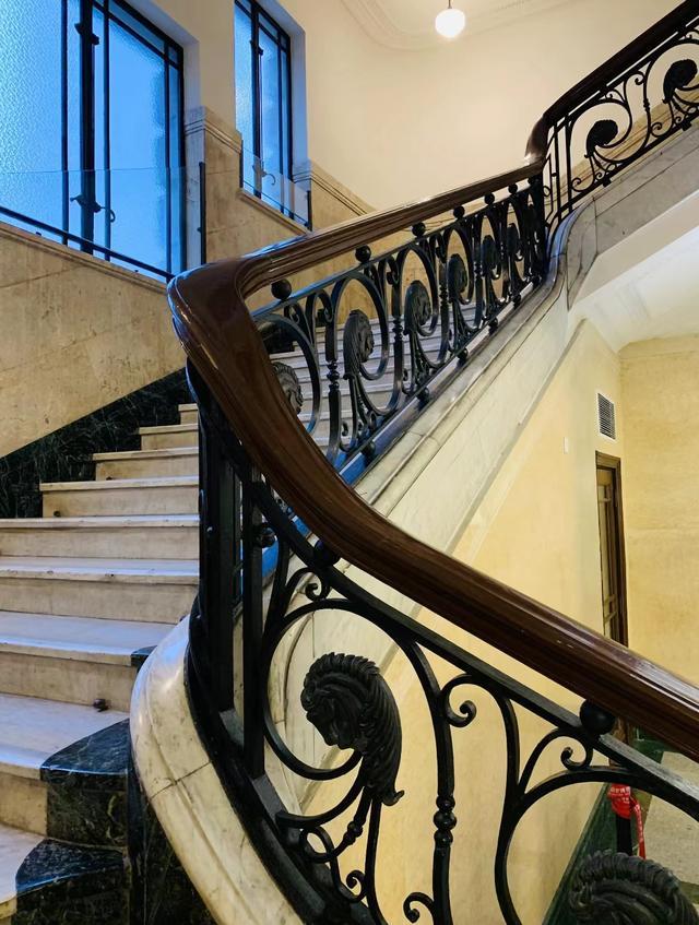 历经近90年的历史,这一建筑内部基本保留了跑马总会大楼20世纪初欧洲古典装饰风格,整体采用米白色的大理石铺地和墙面搭配黑色的铸铁装饰,形成典雅与厚重的和谐统一。与几乎同时期建造的和平饭店类似,在跑马总会大楼的建筑中,也部分采用了法国拉克利水晶玻璃装饰的门作为空间分隔。值得强调的是拉克利玻璃的特殊性在于,由于烧制的过程中融入了锑、砷和钴,成品通常呈现不规则的半透明状,在光照下可以呈现特殊变幻的光影效果。彩色的拉克利玻璃用于通往每一层大厅的大门,让建筑内部空间呈现五彩变幻的梦幻效果。此外,呼应赛马主题,建筑内部装饰的大量细节都采用了“马”这一元素,例如在楼梯的铸铁栏杆上,优雅弯曲的铁艺栏杆在中间汇聚,成一个贝壳般旋转的马头;多个马头顺序排列,共同组成楼梯的围栏;铸铁工艺的马头围栏为建筑内部空间增加了浓厚的艺术感。