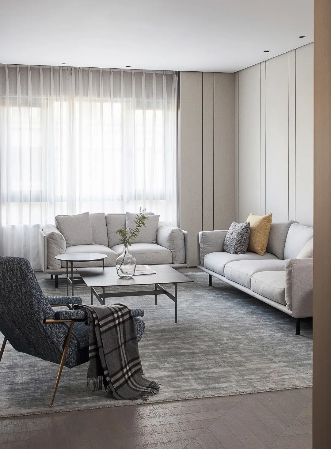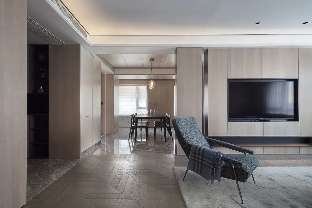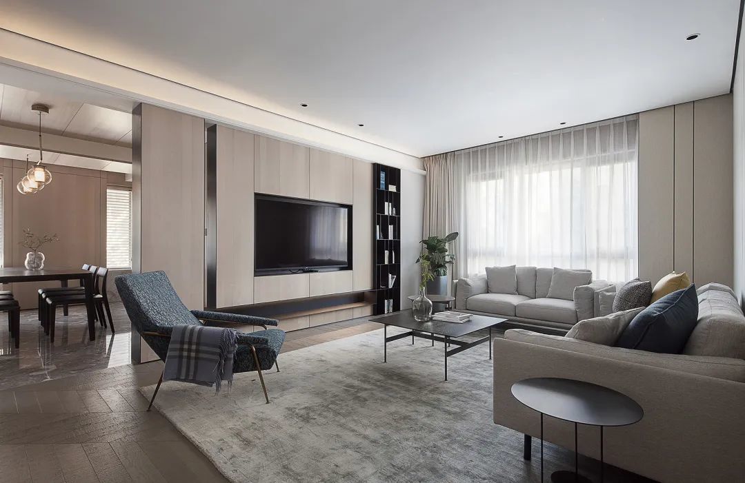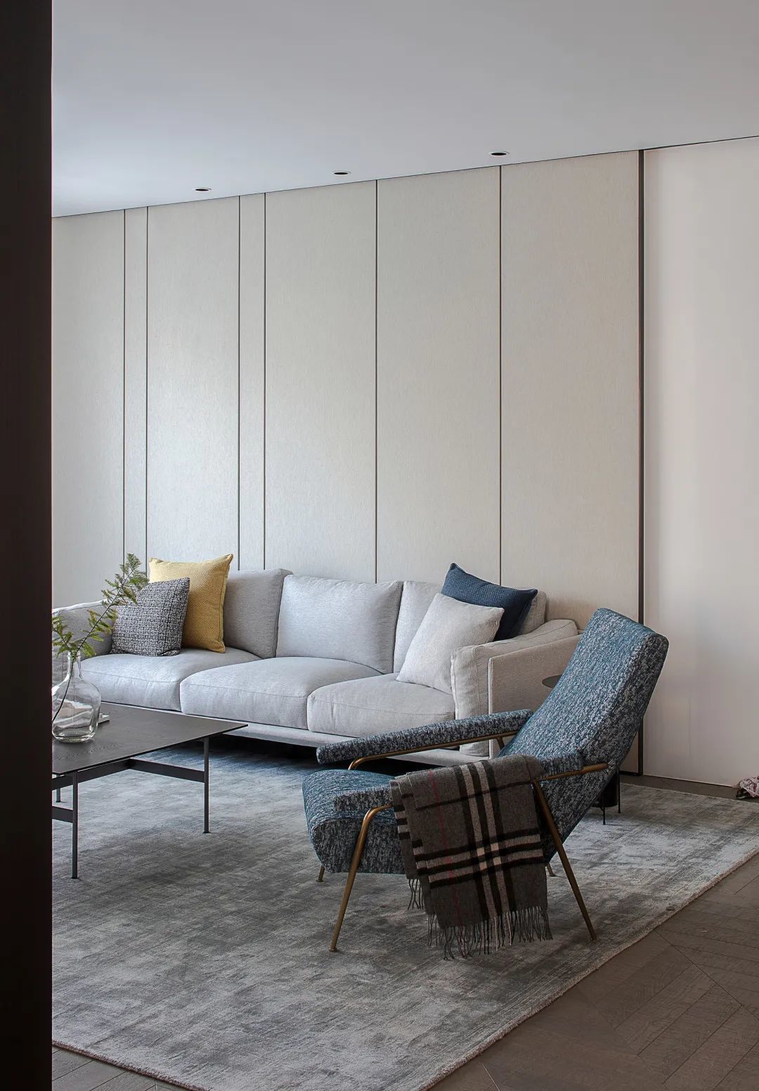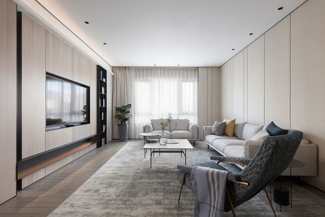 ▲客厅以无主灯的天花设计,木饰面电视墙+硬包沙发墙的组合,木地板地面铺上灰色地毯,整体简约舒适的沙发、沙发椅布置,营造出一个简约自然的客厅氛围感。