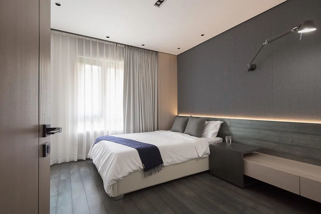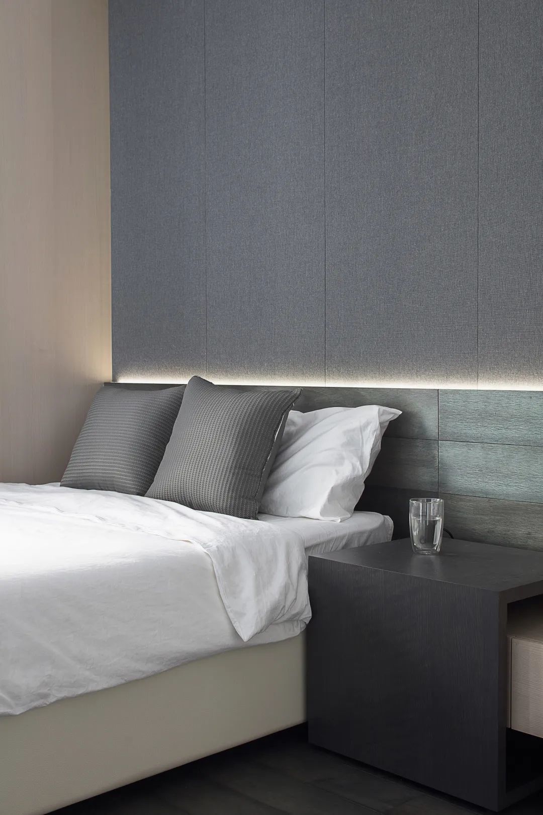 ▲次卧的床头墙以木质感的墙脚+硬包墙身组合,中间加入暗藏灯带,布置皮艺床与白色床单,整个卧室空间简单大方而舒适。