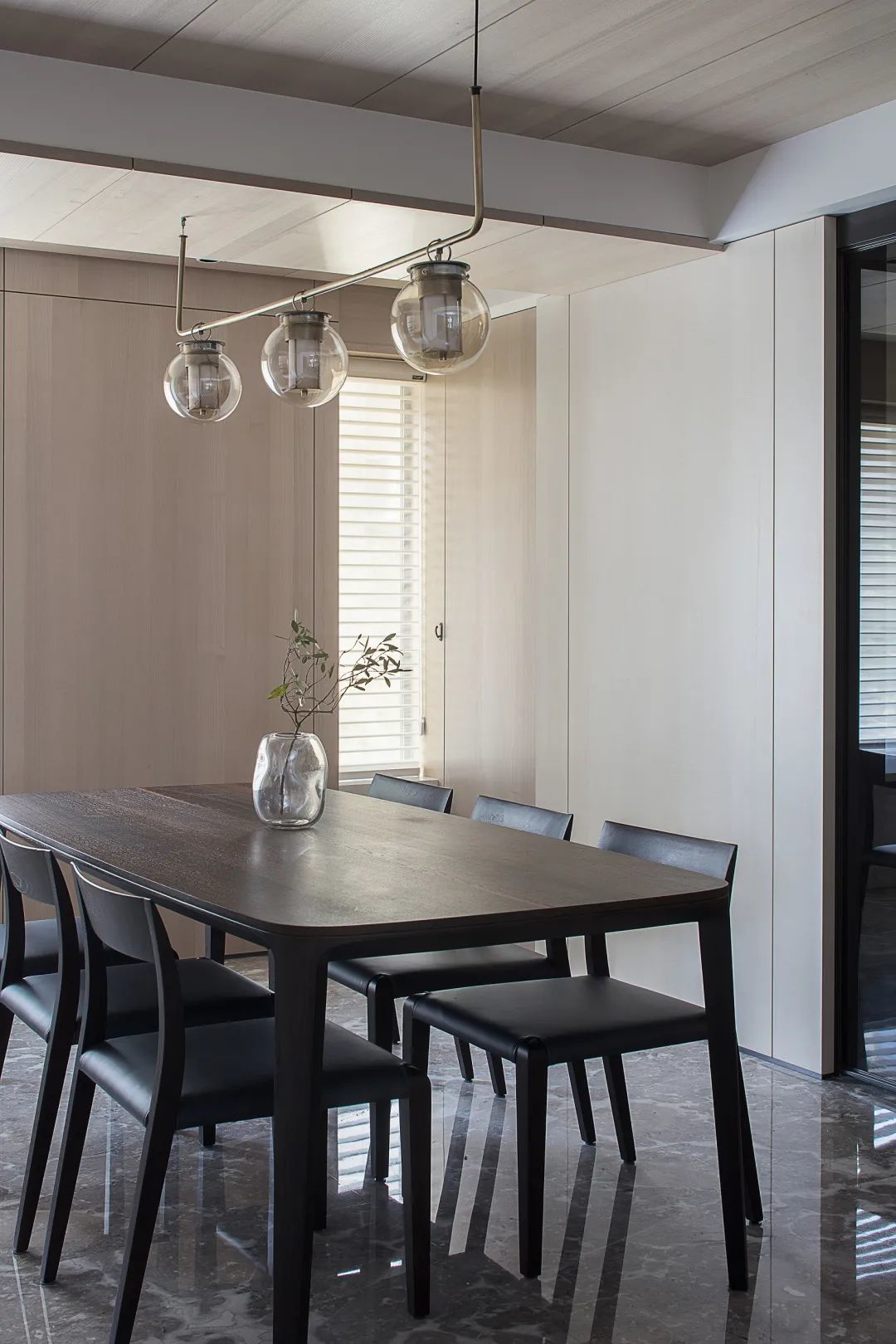 ▲一盏简易精致的金属吊灯,餐桌上再布置一个玻璃瓶花瓶,插上花枝也带来了一个端庄华丽的用餐仪式感。