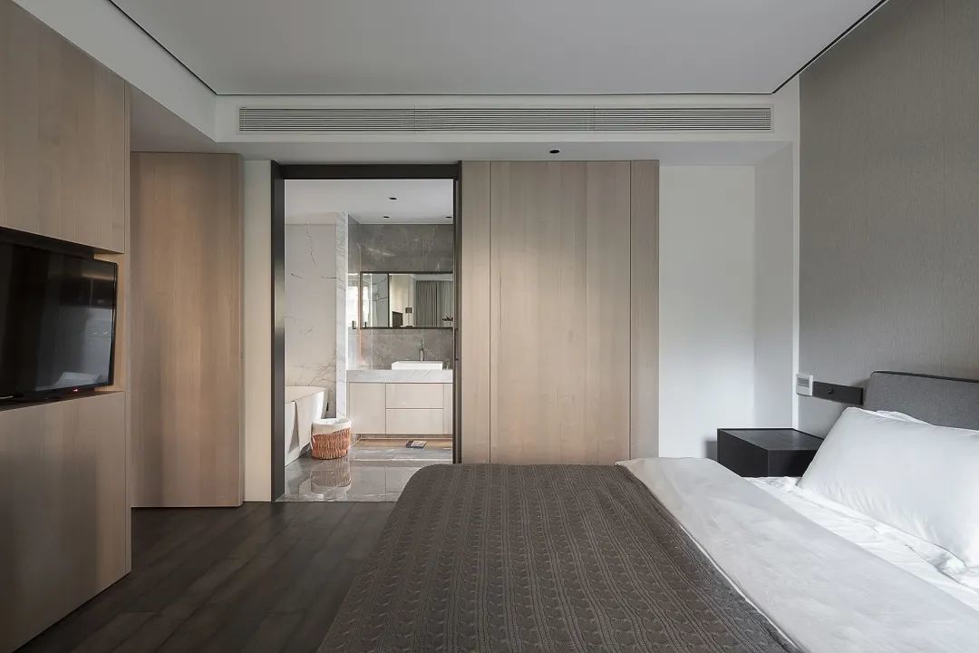 ▲简洁大方的卧室,在白色、木色质感的墙面与柜体搭配下,布置灰白配的床单,也让卧室空间显得惬意自然。