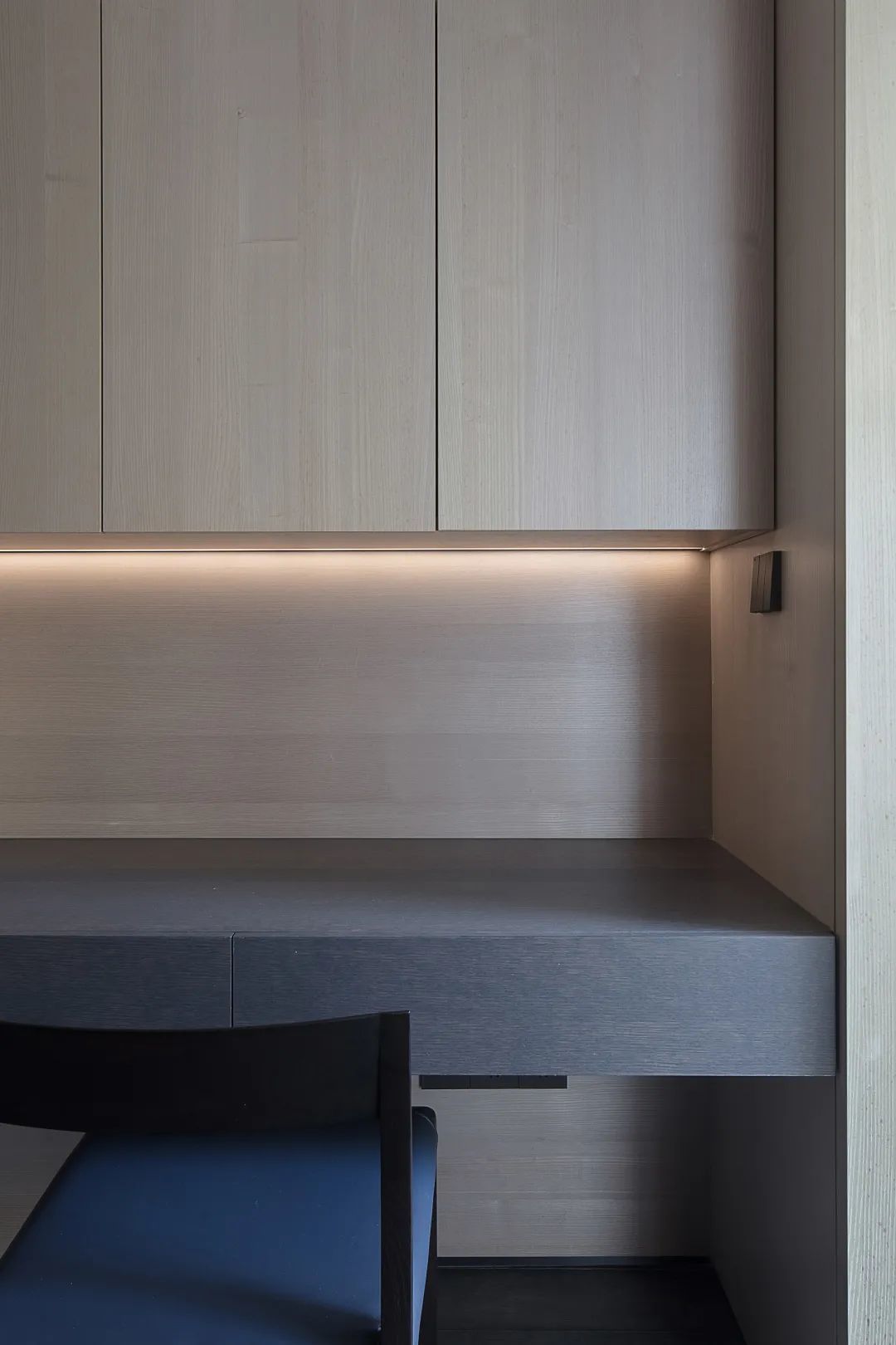▲书桌上方的吊柜底部加入了灯带设计,也让书桌区域明亮温馨而惬意。