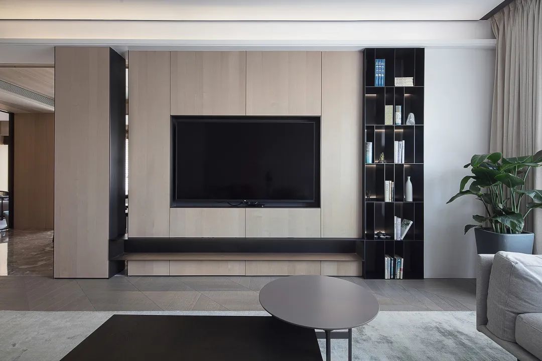 ▲电视墙以木质感的基础,右侧加入黑色的开放书架,摆上精致的书籍、陶艺品等布置,角落还摆着大盆绿植,营造出一种端庄文艺的空间气息。