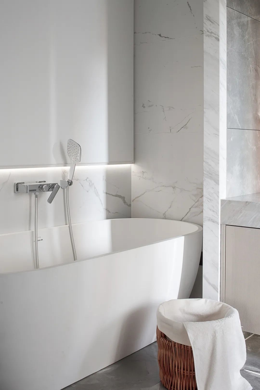 ▲卫生间采取雅白的墙面砖,装上干净洁白的浴缸,侧边墙面造型处也装上了暗藏灯带,整个空间显得时尚优雅而大方。