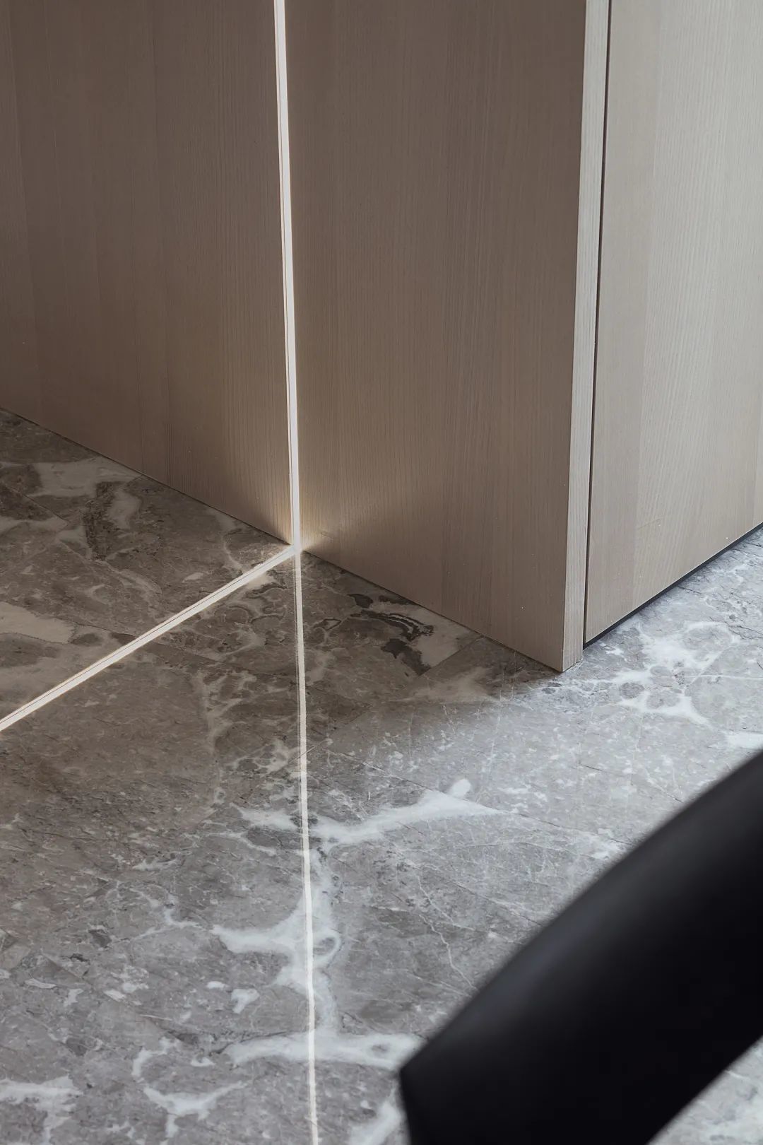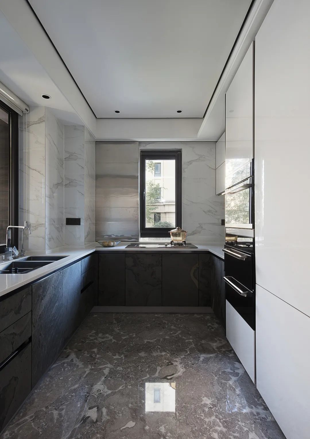 ▲厨房以灰色大理石质感的地面基础,橱柜也是采取岩石灰的质感,加上雅白的墙面,定制嵌入式电器柜的设计,整个厨房设计现代优雅而时尚,为主人提供了一个轻松舒适的烹饪空间体验。