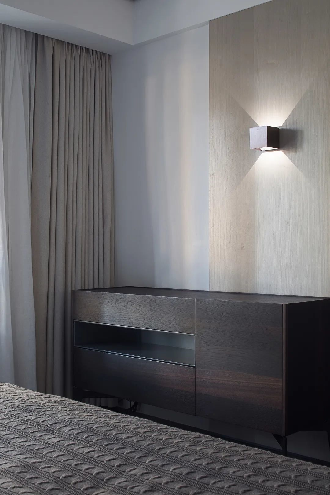 ▲床尾布置深木色小斗柜,墙面加入壁灯的设计,呈现出一种简单而端庄的舒适感。