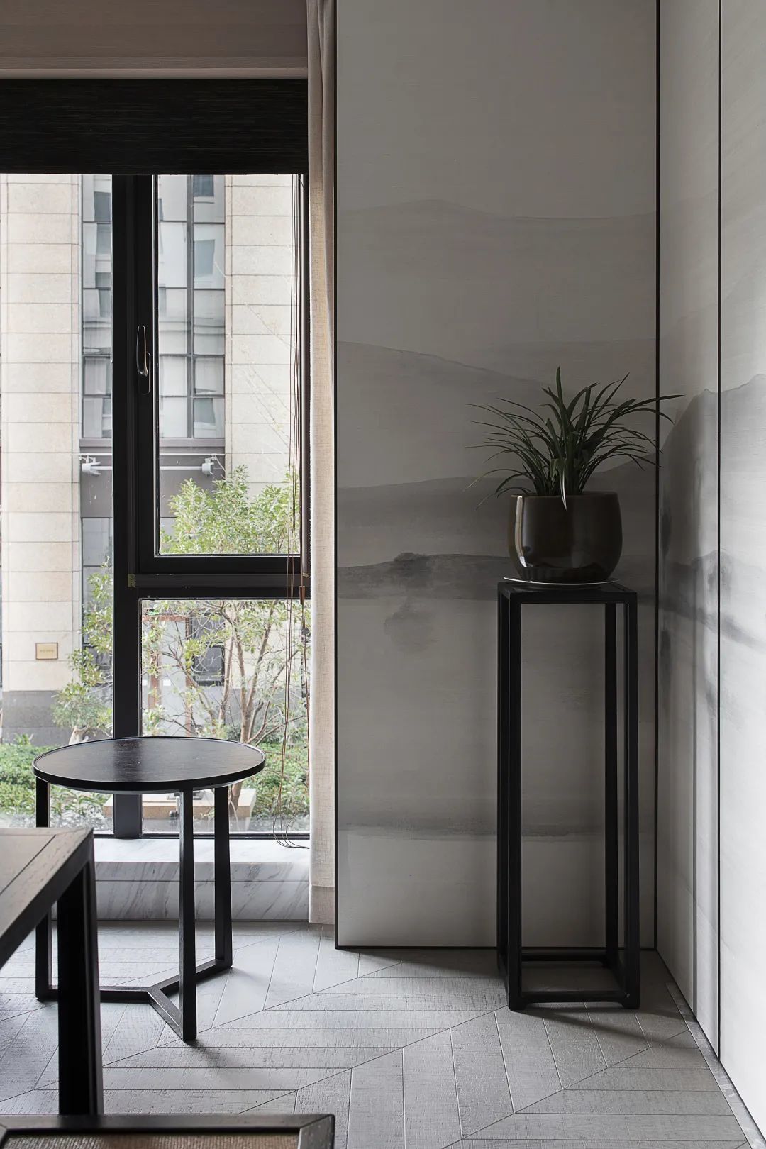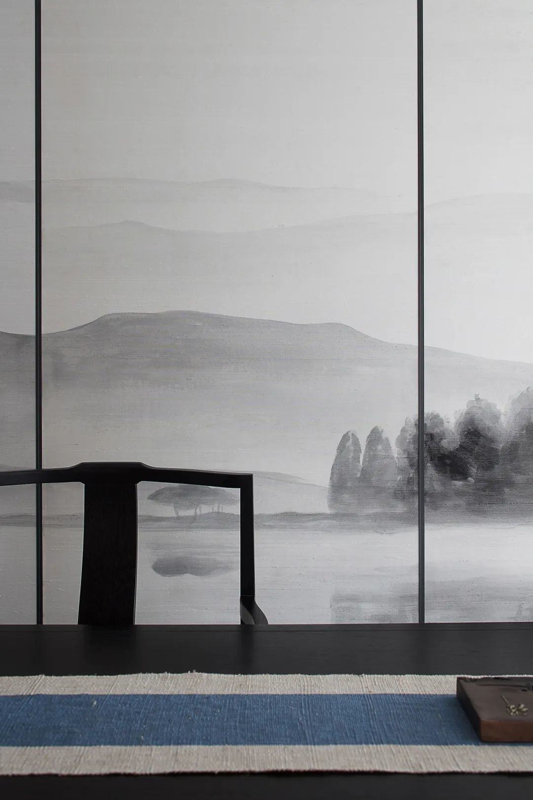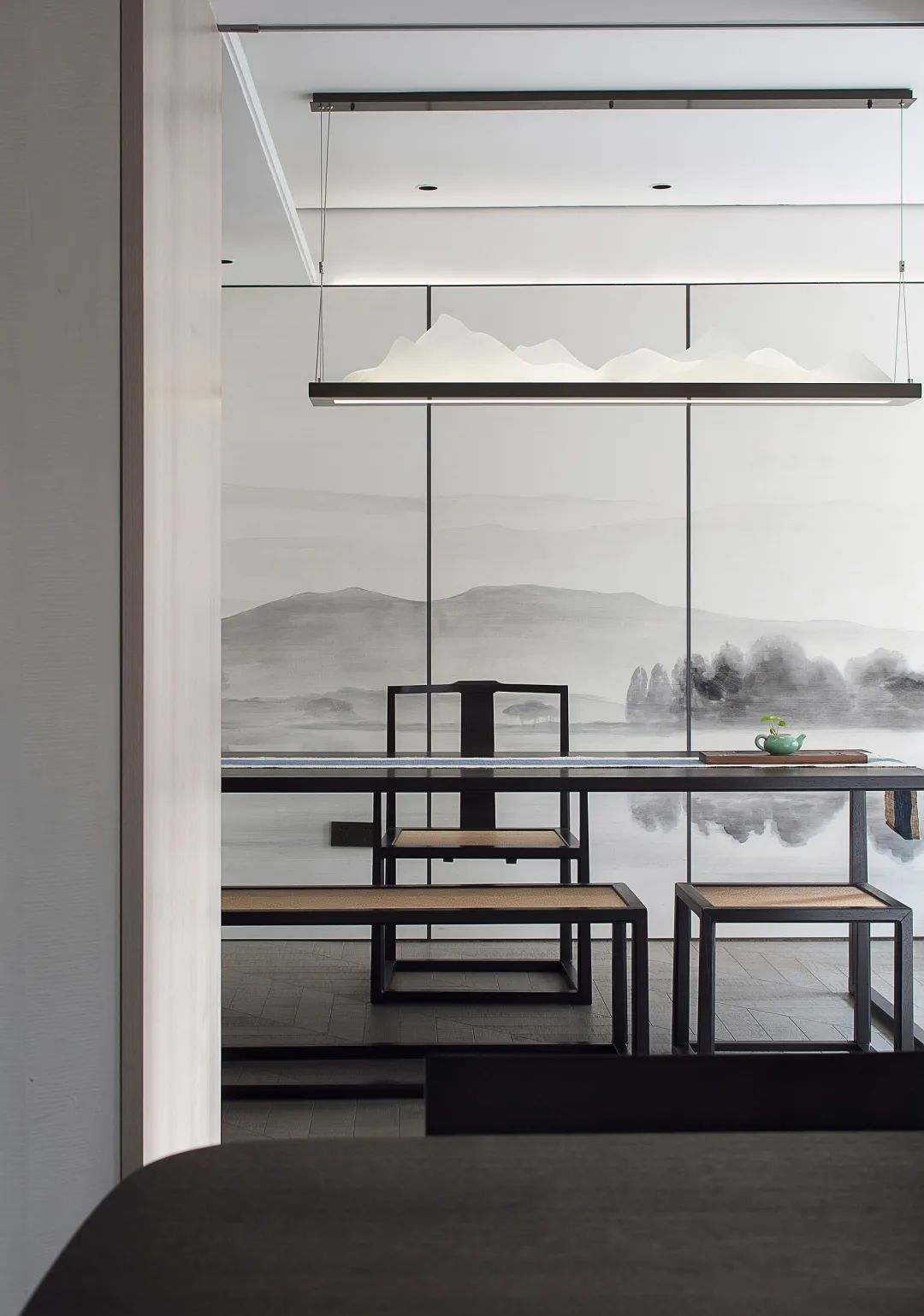 ▲茶室以水墨诗意画面的护墙板为墙面,布置上实木茶桌与椅子,营造出一种禅意端庄的品茶空间氛围。