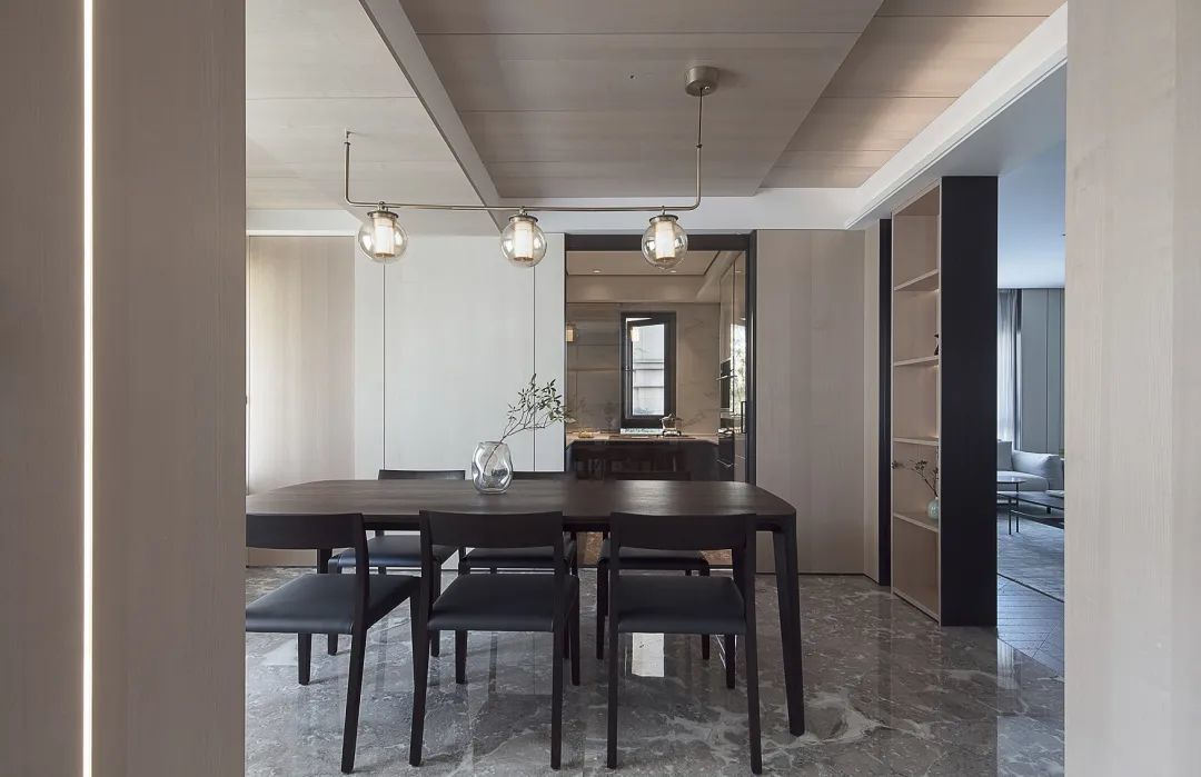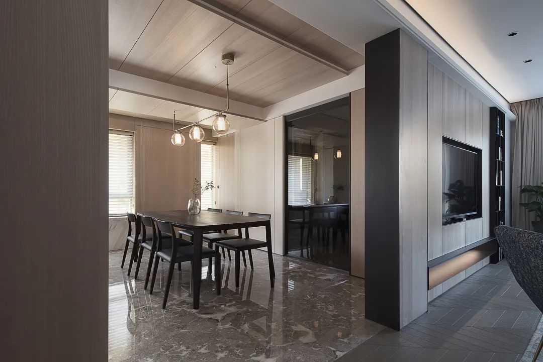 ▲电视墙后方就是餐厅区域,天花以木质感的装饰,地面是贴着大理石纹理的地砖,搭配深色的实木餐桌椅,整个餐厅空间布置显得稳重端庄而自然惬意。