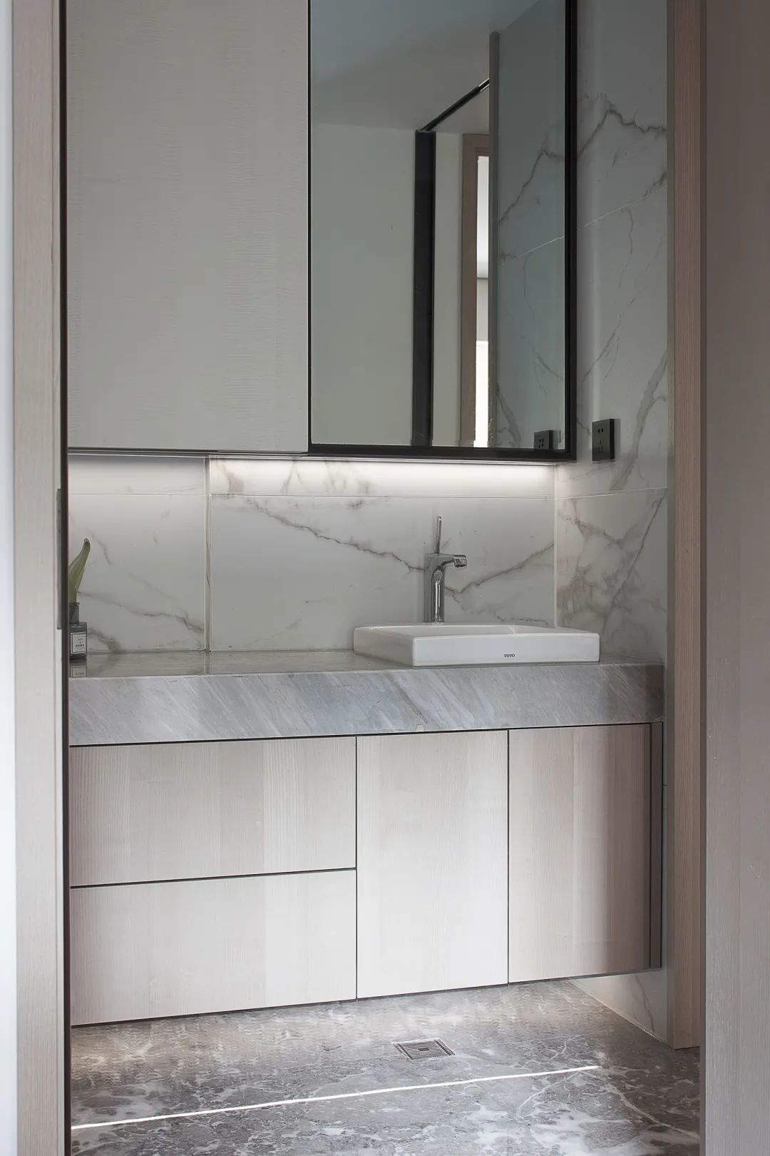▲客人卫生间以灰色地面+洗手盆,装上浅木色浴室柜,雅白的墙面砖+浴室镜柜组合,也是提供了一个时尚简洁的卫浴功能。