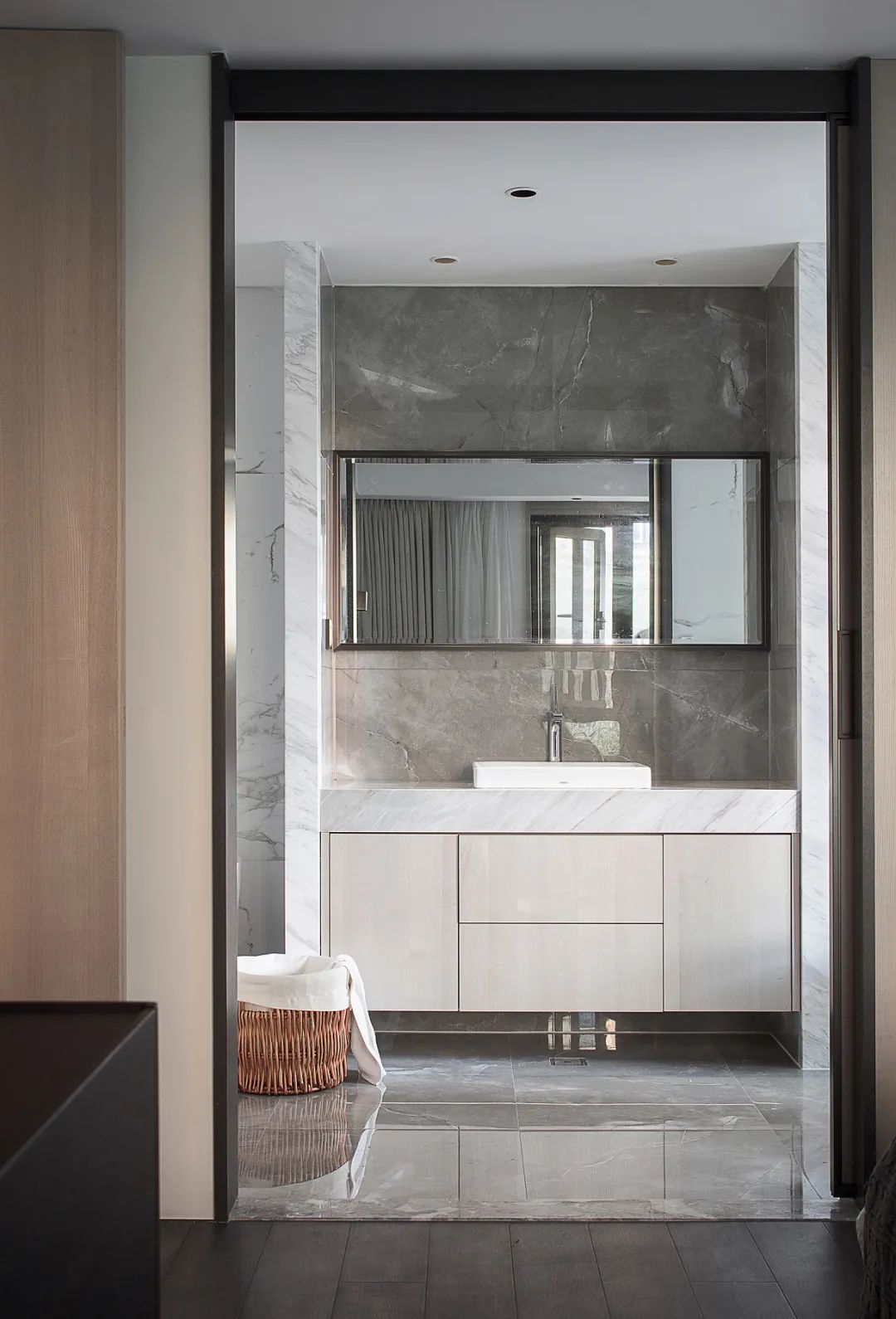 ▲洗手台以干净优雅的大理石质感,再装上木质感的浴室柜,上方挂一面大尺寸的浴室镜,装上台上盆为主人提供了一个时尚优雅的卫浴体验。