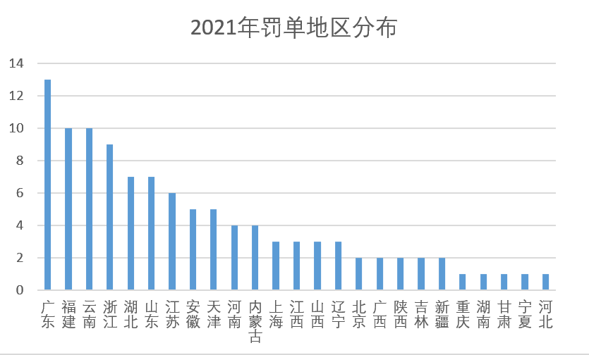从被罚机构的地区分布情况来看,2021年银保监会系统对工行开出的113张罚单分布在全国25个省级行政区。从收到的发单数量排名来看,遭遇强监管的省份为广东、福建、云南。广东辖区内分支机构领取的罚单最多,共有13家分行或支行领到罚单。福建省和云南省并列第二,均有10家分支机构被处罚。