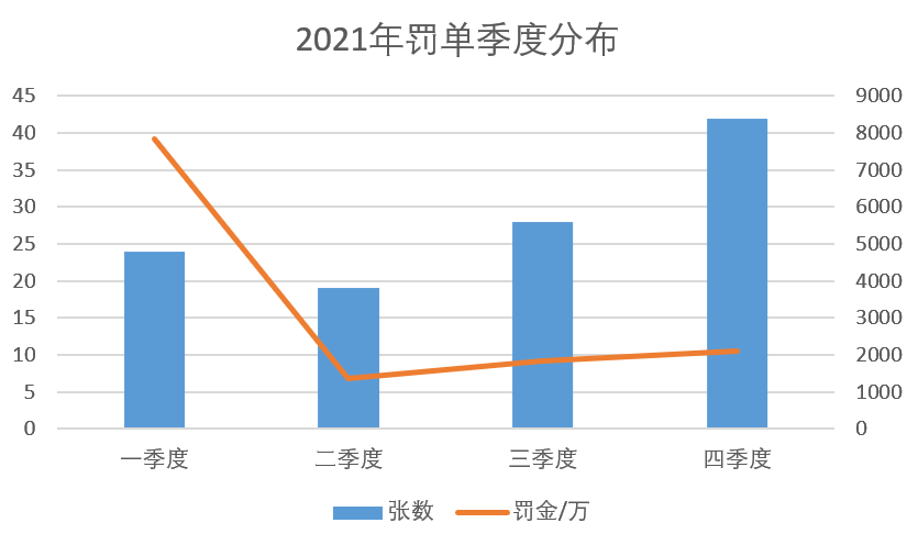 从季度分布来看,工行第一至四季度分别收到24张、19张、28张、42张罚单,罚款金额分别为7846万、1365万、1823.32万、2090万元。因收到2张千万级罚单,第一季度罚金最多,为7846万元,但收受罚单数量为倒数第二。此后,工行收到罚单数量逐季度递增,第四季度被罚张数最多,高达42张,被罚金额为2090万元,仅次于第一季度。