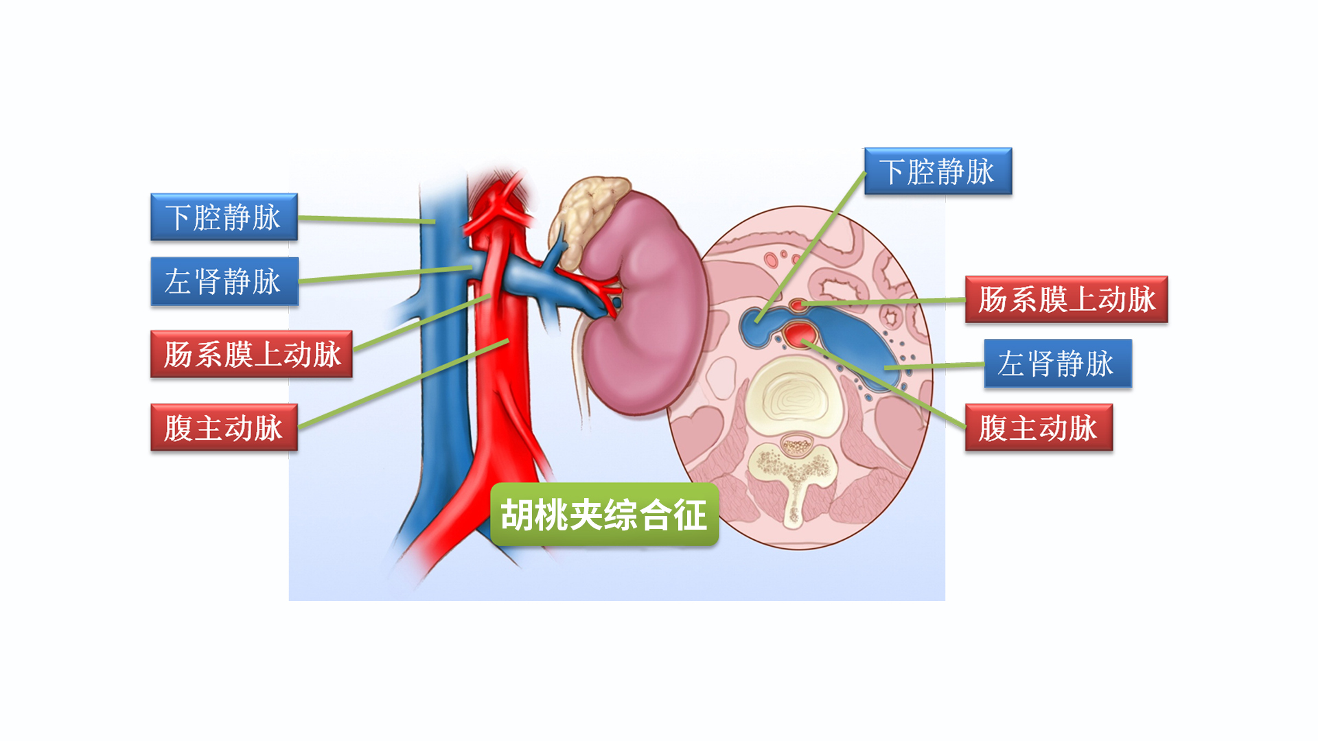 青少年精索静脉曲张经常会让大家想起一个疾病,叫胡桃夹综合征。胡桃夹综合征简单说来,就是左肾静脉回流到下腔静脉的过程当中,被两个很重要的动脉血管,腹主动脉和肠系膜上动脉形成夹角,像“胡桃夹”一样夹住左肾静脉,造成了静脉回流的阻碍。