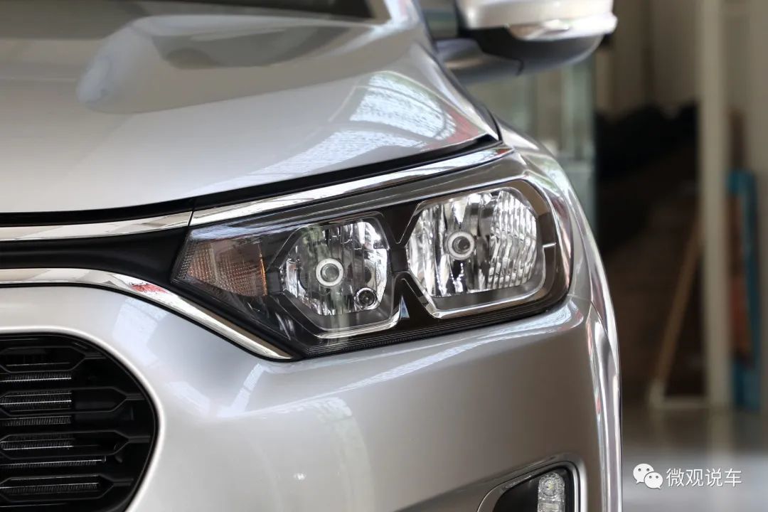 从车头看,流畅线条勾勒,轮廓饱满,给人比较圆润的感觉。两侧大灯中间有两条银色的镀铬饰条连接,并且和logo连成一体,长条形中网格栅处于车头正中间,内部黑色网纹结构,下部格栅更扁平化,雾灯区域线条更加尖锐,再加上引擎盖上突出的肌肉线条,增强力量感。