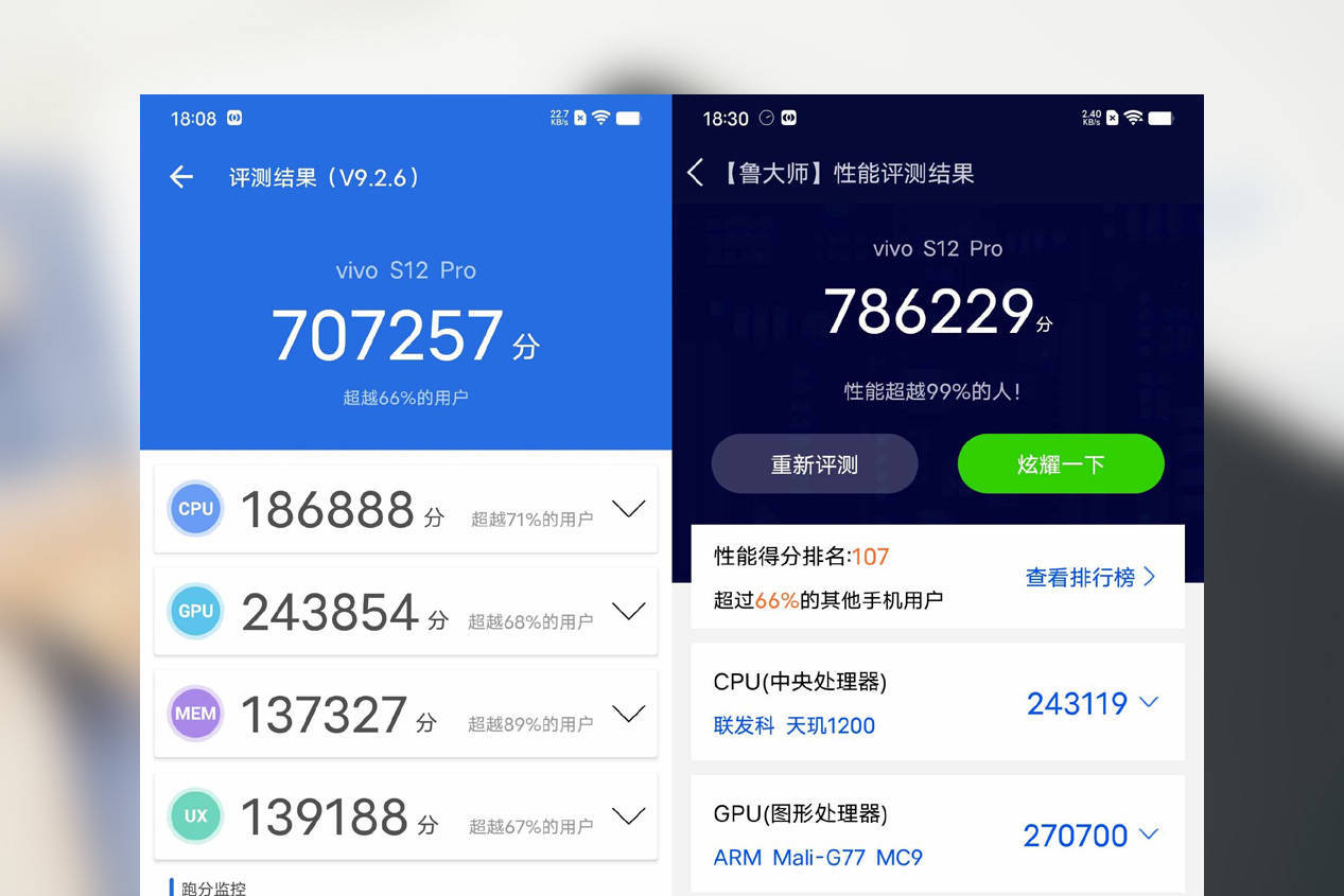 首先vivo 12 Pro的处理器为联发科天玑1200,也是比较热门的旗舰处理器,因此可以从性能上保证流畅的游戏体验。在安兔兔和鲁大师两大平台上,vivo S12 Pro分别拿下了70万分和78万分,从跑分成绩上就让人感觉非常放心。