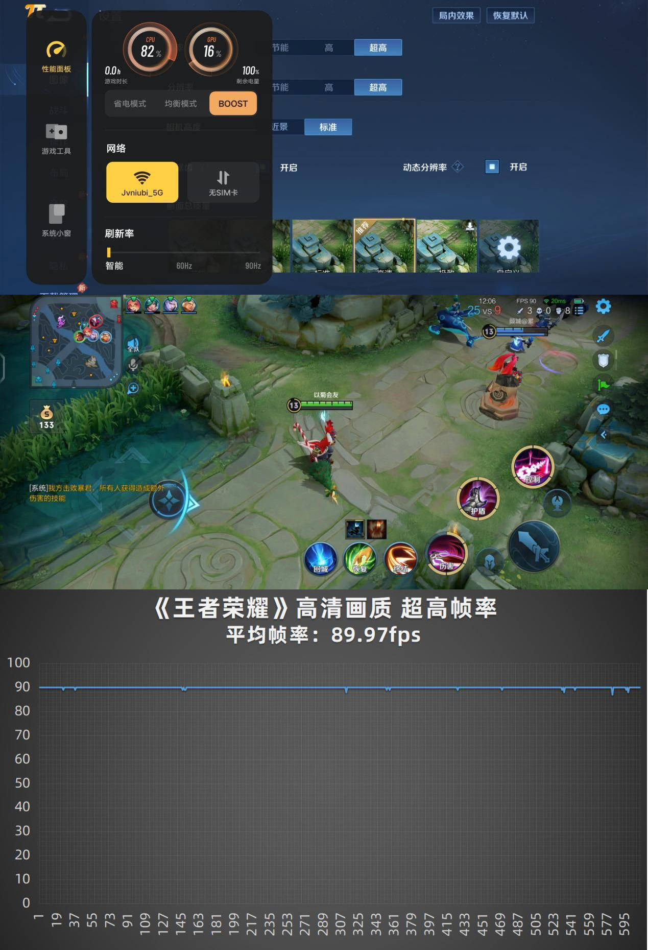 作为一部通过了KPL官方测试认证的产品,这次vivo S12 Pro专门加入了BOOST模式,因此我们直接在该模式下用《王者荣耀》进行测试。在高清画质、90FPS超高帧率的设定下,vivo S12 Pro的平均帧率稳定在89.97FPS,几乎就是满帧的状态。通过帧率图我们也能看到,无论是前期遭遇战、还是后期的团战,它的帧率输出都非常稳定,没有受到丝毫的影响。
