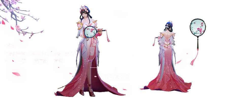 梅花纸扇,戏曲发型,拖地长裙,配上昆曲名家魏春荣老师优美缠绵的精心配音,柔媚婉转,令这款两周年限定皮肤更加熠熠生辉。在皮肤设计中,官方巧妙地还原了杜丽娘大家闺秀的形象,手持团扇、婀娜多姿。凋零的梅花,朦胧的月色,也表现出人物的哀思与惆怅。