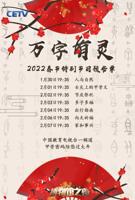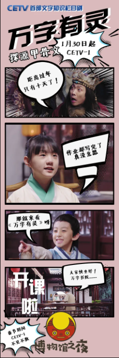 1月30日起,中国教育电视台首部文字知识栏目剧《万字有灵》之“探源甲骨文”将在中国教育电视台一频道(CETV-1)开播,破解甲骨密码,探索造字知识,让甲骨文从博物馆走进青少年的日常生活。