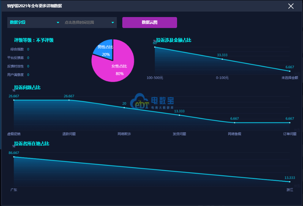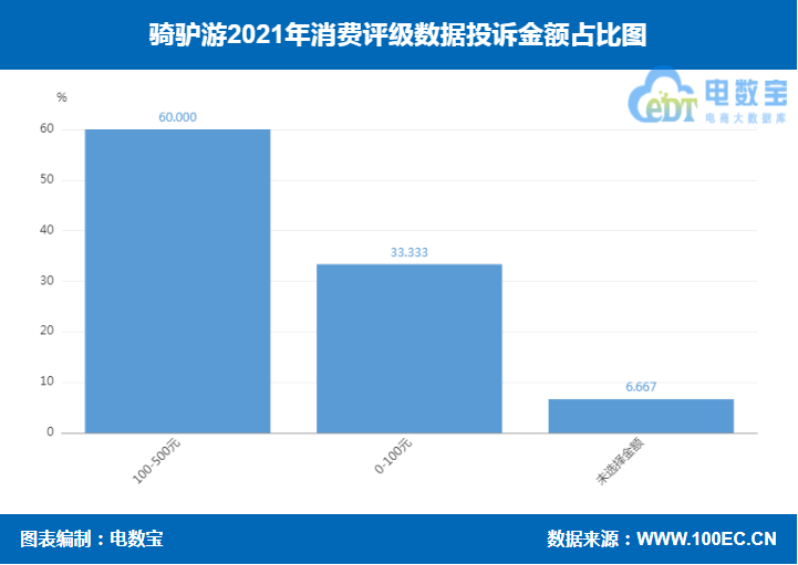 根据网经社旗下电商大数据库“电数宝”显示,用户投诉“骑驴游”的消费金额主要在100-500元、0-100元及未选择金额区间。