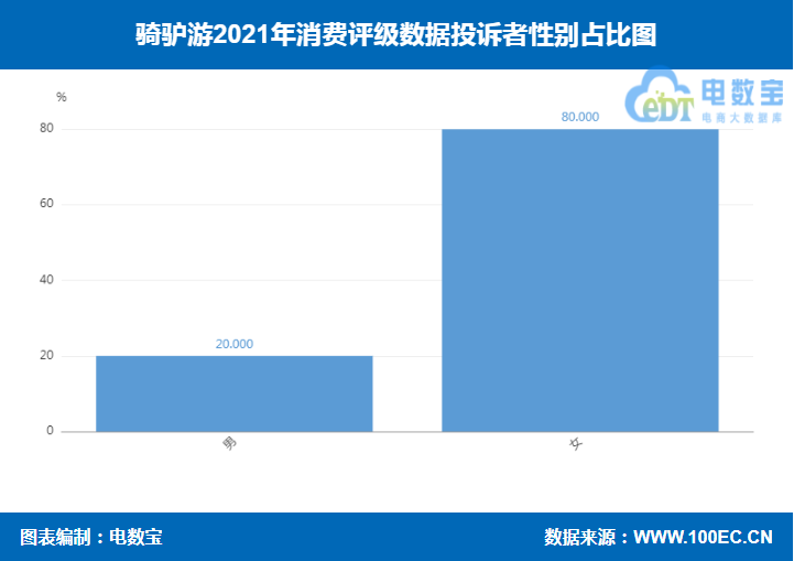 根据网经社旗下电商大数据库“电数宝”显示,在投诉“骑驴游”的用户中男性占20%,女性占80%。