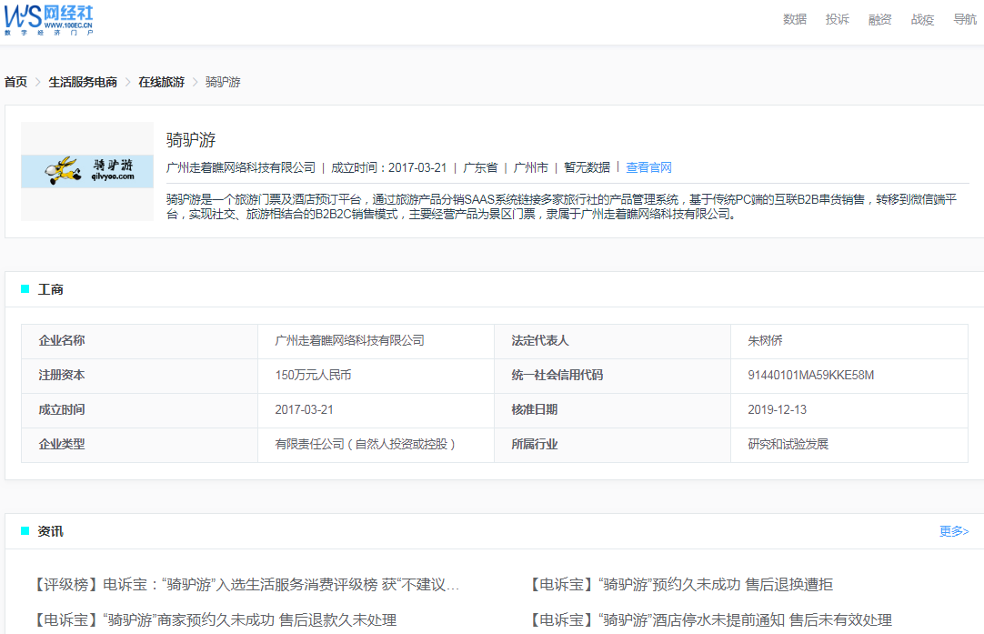 据网经社企业库(COP.100EC.CN)显示,骑驴游隶属于广州走着瞧网络科技有限公司,法定代表人朱树侨,是一个旅游门票及酒店预订平台,通过旅游产品分销SAAS系统链接多家旅行社的产品管理系统,基于传统PC端的互联B2B串货销售,转移到微信端平台,实现社交、旅游相结合的B2B2C销售模式,主要经营产品为景区门票。