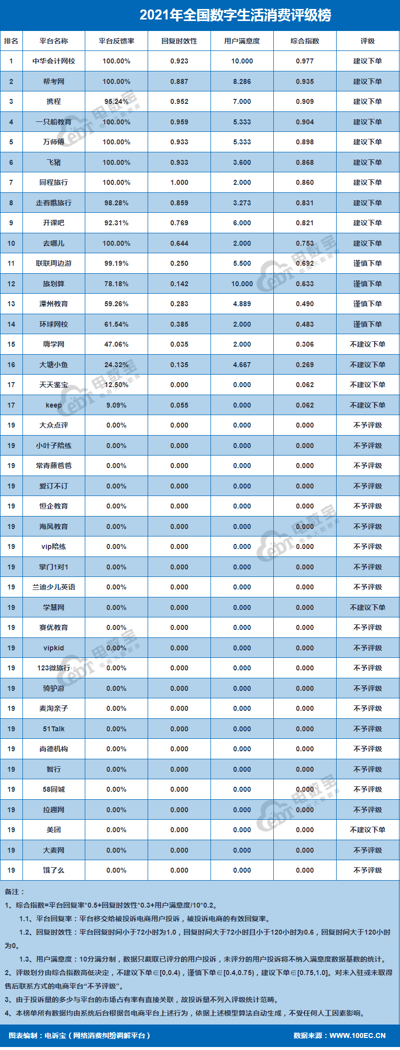 在“2021年全国数字生活平台消费评级榜”中,获“建议下单”的平台有中华会计网校、帮考网、携程、一只船教育、万师傅、飞猪、同程旅行、走着瞧旅行、开课吧、去哪儿;获“谨慎下单”的平台有联联周边游、旅划算、潭州教育、环球网校;获“不建议下单”的平台有嗨学网、大塘小鱼、天天鉴宝、keep、学慧网、美团;获“不予评级”的平台有大众点评、小叶子陪练、常青藤爸爸、爱订不订、恒企教育、海风教育、vip陪练、掌门1对1、兰迪少儿英语、赛优教育、vipkid、123微旅行、骑驴游、麦淘亲子、51Talk、尚德机构、智行、58同城、拉趣网、大麦网、饿了么。