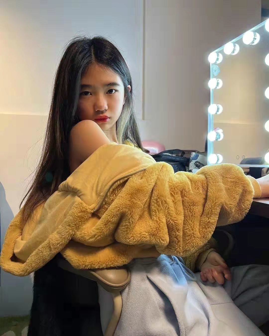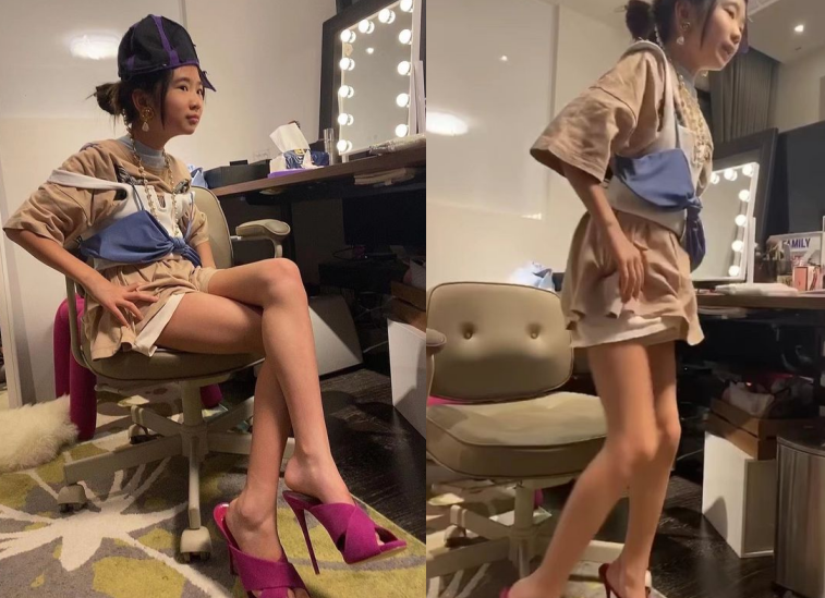 照片中11岁的Grace披散齐肩头发,化着浓妆涂红唇,衬出嘴巴嘟嘟有肉感。让网友惊讶的是她的衣着,身穿一件羊羔绒外套和灰色裤子,衣着愈发向成年人靠拢。面对镜头,Grace拉下外套露出肩膀,摆出最满意的造型。看得出她很会抓镜头。