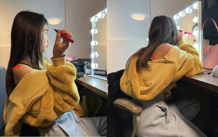 另一组图片中Grace娴熟地拿起桌面上的眼线笔,俯下身子靠近化妆镜勾勒眼线,向大家展示她高超的化妆技术。从两处细节看出,她的内搭是一件黑色露背吊带。此图片一出引起不少网友的争议,有人留言称Grace年纪太小,装扮也比同龄人成熟,应该专注学习。