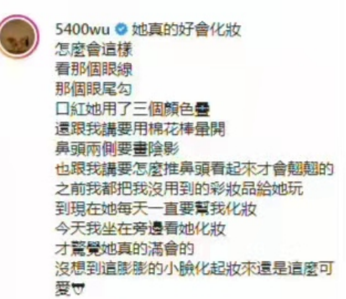 而作为化妆师的吴速玲发表一段话夸赞Grace的化妆技术,称Grace已经把眼线画得很好,连涂上嘴唇的口红也要用三层颜色叠加。吴速玲索性把余下的化妆品给女儿玩,自己坐在旁边看女儿做造型。