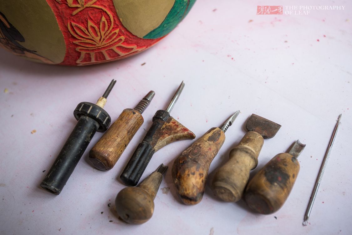 原本以为雕刻出如此精美的图案,工具应该也很精细。然而当我看到在工作台上的一些工具,真的有些惊讶。这是大师雕刻葫芦的所有工具,这些工具形状奇特,材料也不一,有木头根做的,还有废旧的塑料。据说这些工具也是大师自己制作,虽然看着不怎么特别,但他用得很顺手。