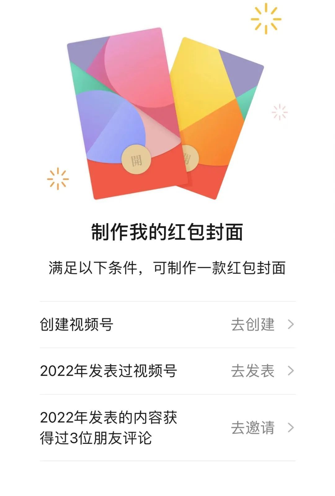 三点要求包括:创建一个视频号、2022年发了至少一个视频、2022年获得了至少三个人的评论。官方表示,上面的条件都做到了之后,进入“发红包页”-“限时活动入口”就可以参与定制了。