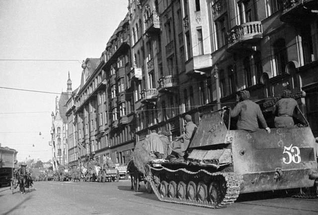 1944年10月苏军马车和СУ-76М自行火炮在解放的里加大街上