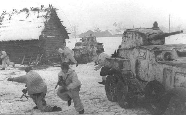 1944年1月19日突击第2集团军海军步兵第71旅乘坐БА-10М装甲车冲入德军占领的红谢洛村