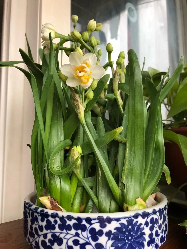 中国水仙每个鳞茎上可以开出3~7朵花茎的。整个鳞茎买回家里也很容易打理,就用一个浅盆养着,装上一点点清水,可以摆放在有适当散射光的地方。