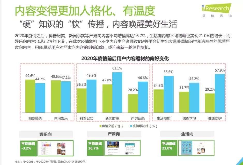 进入2020年,疫情影响下,消费者对于知识直播有了更多需求,短视频、直播间成为用户获取不同领域知识、技能重要阵地。艾瑞咨询《2020年中国移动互联网内容生态洞察报告》就显示,用户对科普实用知识向内容需求增加,生活向、严肃向的泛知识内容需求分别提升了21%和16.7%,相对而言娱乐向内容的需求小幅下滑。
