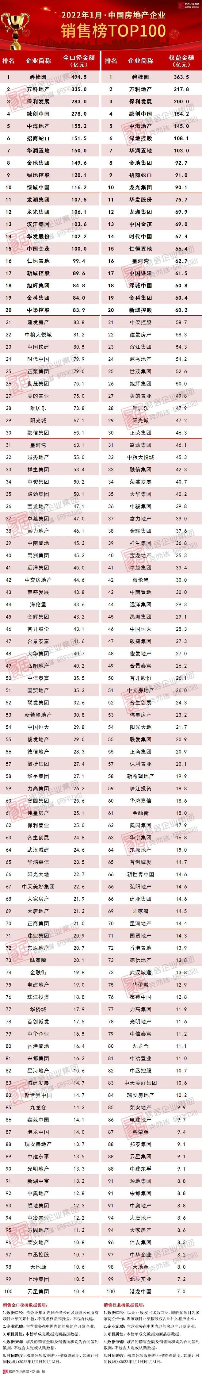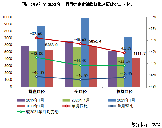 2022年1月,中国房地产市场整体延续了去年下半年以来降温的趋势,多数规模房企销售表现不佳,单月业绩同比以及较去年月均水平变动都有明显下降。1月,top一百房企实现销售操盘金额5256亿元,单月业绩规模同比降低39.6%,较2021年月均水平降低43%。