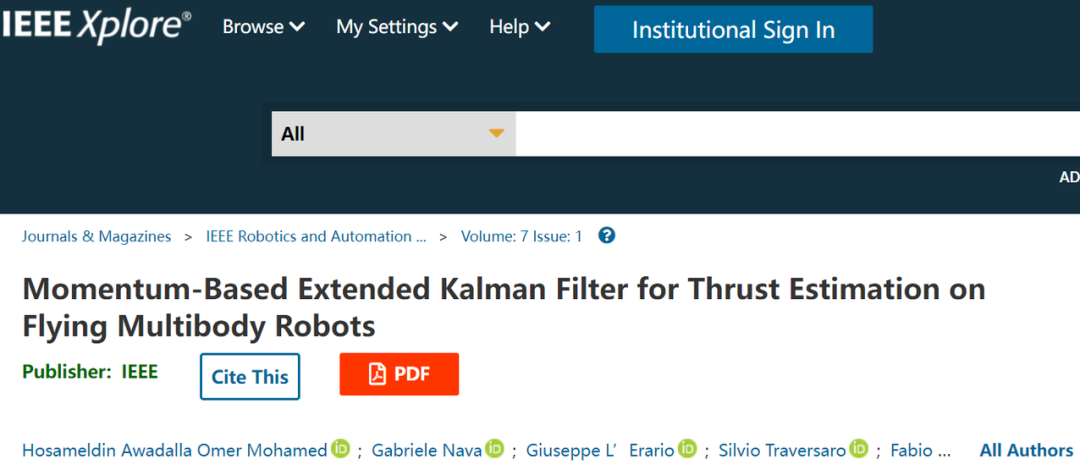 2021 年 12 月 19 日,相关论文以《基于动量的多体飞行机器人推力估算扩展卡尔曼滤波》(Momentum-Based Extended Kalman Filter for Thrust Estimation on Flying Multibody Robots)为题发表在 IEEE Robotics and Automation Letters 上,由意大利理工大学人工智能和机械智能实验室研究员丹尼尔·普奇(Daniele Pucci)担任通讯作者 [1]。
