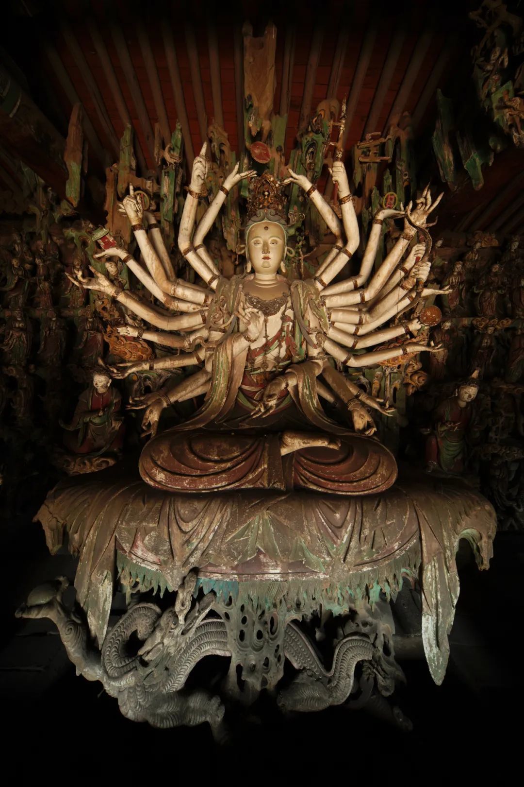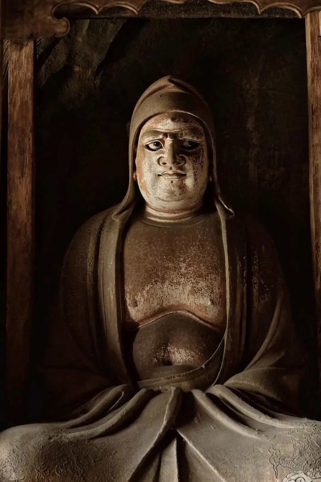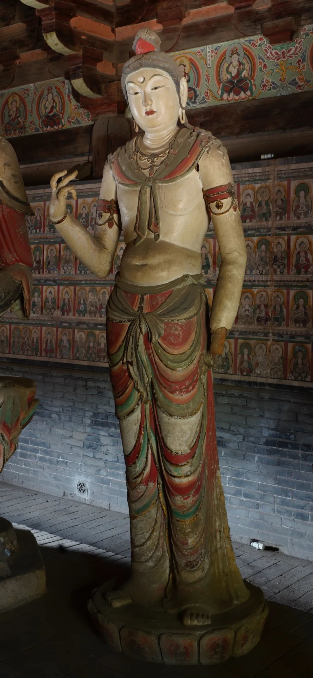 不说日本罢,此行关心的还是山西。镇国寺初为北汉皇室兴建,后世仍不断得到敕封,足以说明三晋大地,皇家建筑是很常见的,中华文化中的极致者,潜移默化地化育在此地的风土里。镇国寺内,不仅建筑是无价瑰宝,万佛殿内的五代彩塑亦极为珍贵。佛坛的布局形制沿袭了唐代古制,具有特别的研究价值,其造像的精美度也是无与伦比的,特别是两侧的胁侍菩萨,庄谐同生,动静相宜,几乎与敦煌莫高窟四十五窟 (盛唐时期) 的两尊异曲同工,甚至不由得叫人凭空猜测,会否出自同一工匠之手?