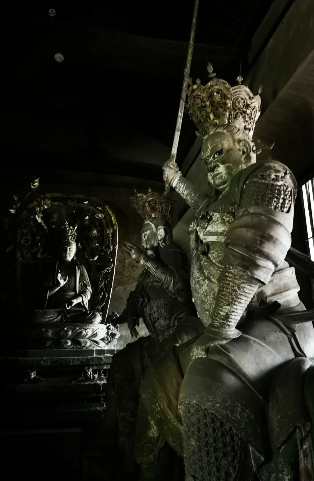 天王殿后的第一进院落是释迦殿,因限流,我们只能在门口的狭窄空间内看个大概。空气中的灰尘,在几缕透过窗棂的光线中飘浮着,昏暗的气氛里,隐约地藏匿着各样的影子。突然间,我莫名地感觉到,左右两侧分别有一道斜视的目光,瞄向我,刺向我,让我无法躲藏;两尊力士背靠着大殿的前墙,威武伫立,黑暗遮去了他们表情与衣着的所有细节,唯有那质疑、呵斥和惩戒的目光,令人胆寒。这斜视的一瞥,如闪电般,怕是会瞬间击中所有信众的要害,使他们的心灵彻底暴露在外,无从蒙蔽。据说,所有造像的眼睛,都是由山西当地的特种琉璃制成的。艺术的真谛在于,一旦物有了神,世界也便不再是曾经的样子了。