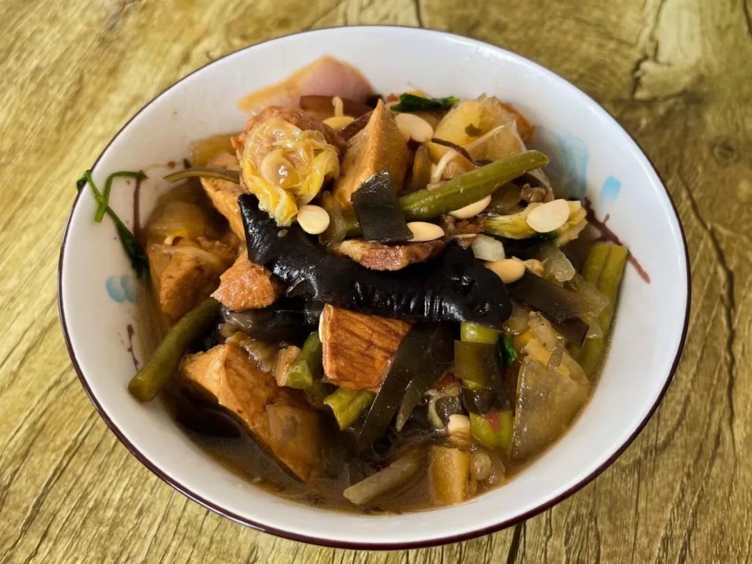 这时候,又来人招呼我们吃饭了。堂屋里,两张大圆桌子排开,大家各就各位。我们先吃了几颗院子里的杏树结的果子,再喝几口茶,等着上菜。而稍后端上来的,菜只有一种,每人一大碗,茄子、豆角、土豆、白菜、海带、粉条和豆腐,还有肥瘦相间的大块猪肉,统统烩在一起,东北胃口的我,像是回家了一样,呼呼地一气,就连菜带汤吃掉了。主食是白馍,还有一种很特别的黄米枣糕。先生边吃边说,这种一层黄米黏面、一层红枣蒸成的大块枣糕,乡里人以前是很难吃到的,只有逢年过节或红白喜事才配享用。