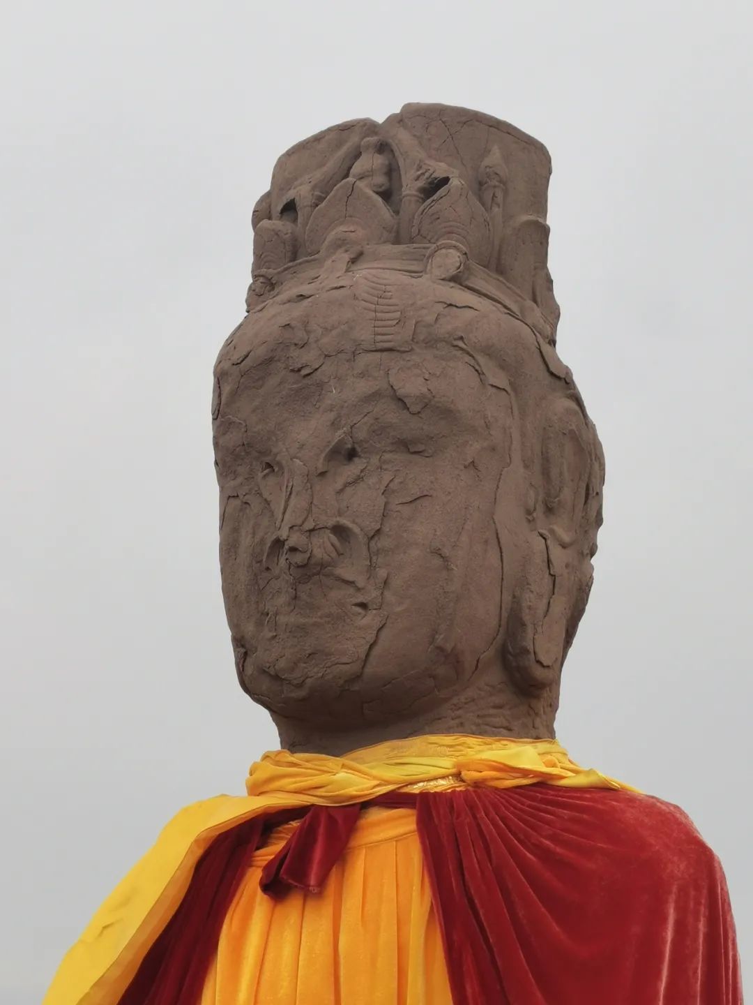 从东边的“石勒寨”,穿过整个村子,我们来到西边的西沟垴。根据《大地文章》里的说法,当地的“垴”,就是用石块垒护崖壁的高台;垴上是普济寺的遗址,如今只有北魏遗存的“丈八佛”孤零零地伫立在那里。这高达四米的立佛,是“文革”中村民们重新立起来的,可惜方向弄反了,面朝北向。晚风吹拂着到处蔓生的刺槐,远处的公路上奔跑着一辆辆运煤卡车,唯有这尊丈八石像,身披红黄相叠的帔风,映照在夕阳的余光下。石佛的头饰尚存有华美的造型,只是其面部却几经风雨,风化斑斑,层层脱落,依稀可辨出原来的笑容模样。