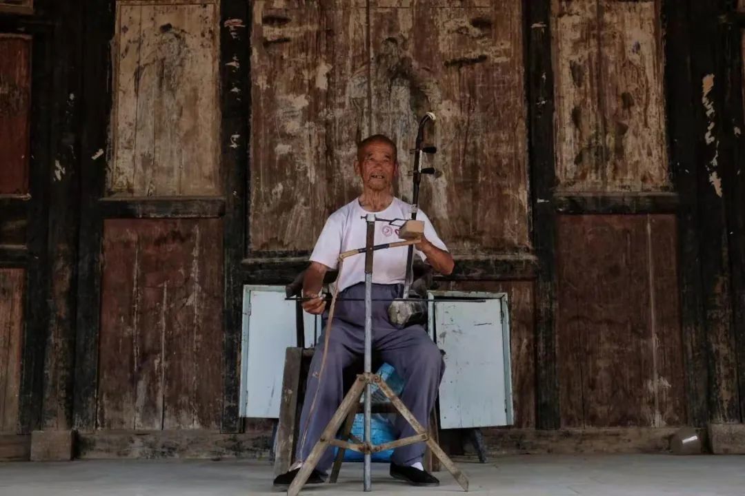 李跃山稳稳地坐在戏台中央,表演心切,看起来等了我们好久了。他满脸皱纹,骨骼凸起,皮肤被太阳晒得紫红发亮;一手持胡琴,一手拉琴弓,一只脚拴着线绳,上端连着木棍,用来敲打木板控制节奏。跑腿秧歌根植于黄土地,调子高亢,音色粗犷,一点儿也不悠扬。而因老人的声音略带碎裂感,高调处全凭一股气力,便更会显出泥土的气息和岁月的沧桑。老人家气定神闲,足足唱了一整段,又突然站起来,比比画画,大声讲解。