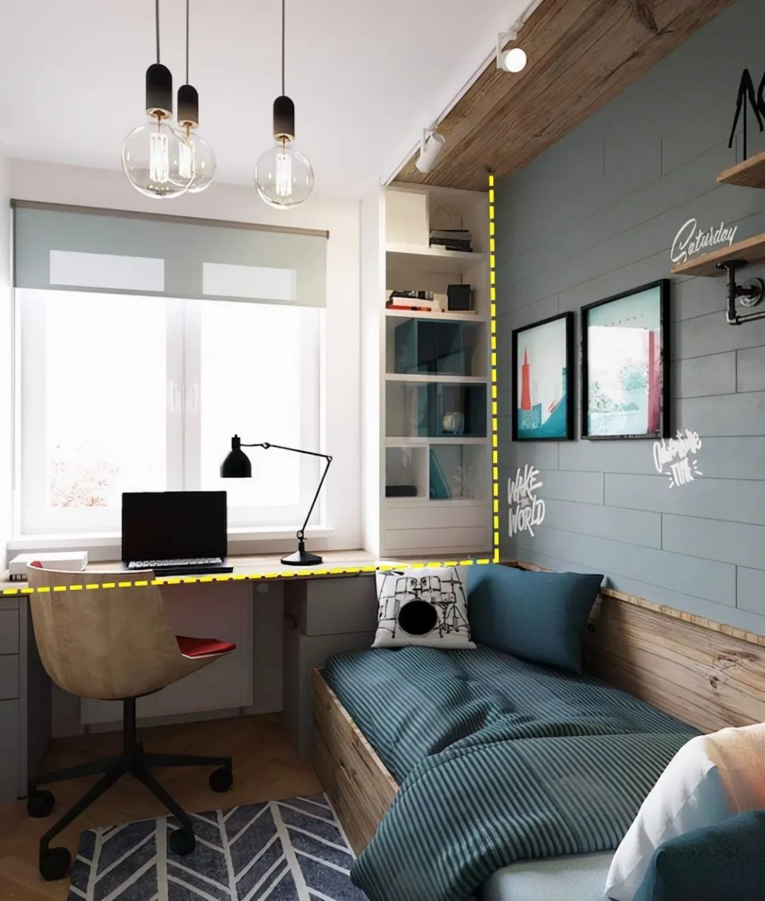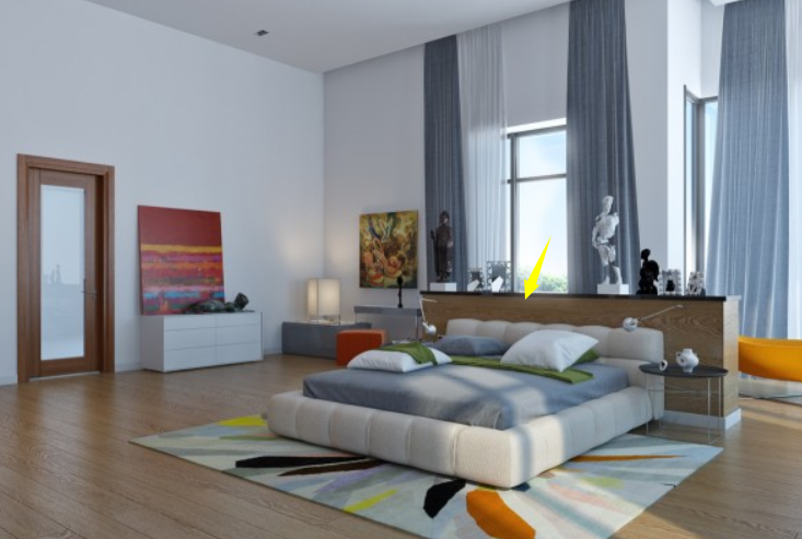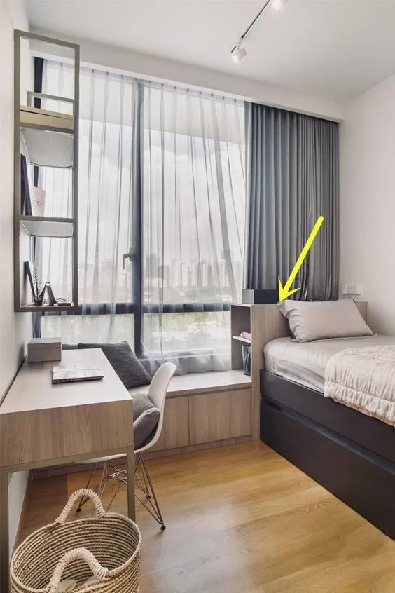 床头靠窗加一字型矮柜之后,那么对于窗户的窗帘就有了局限,因此窗帘长度最好与窗户高度一样,建议选择百叶窗帘或卷帘,收拉与矮柜都不冲突。